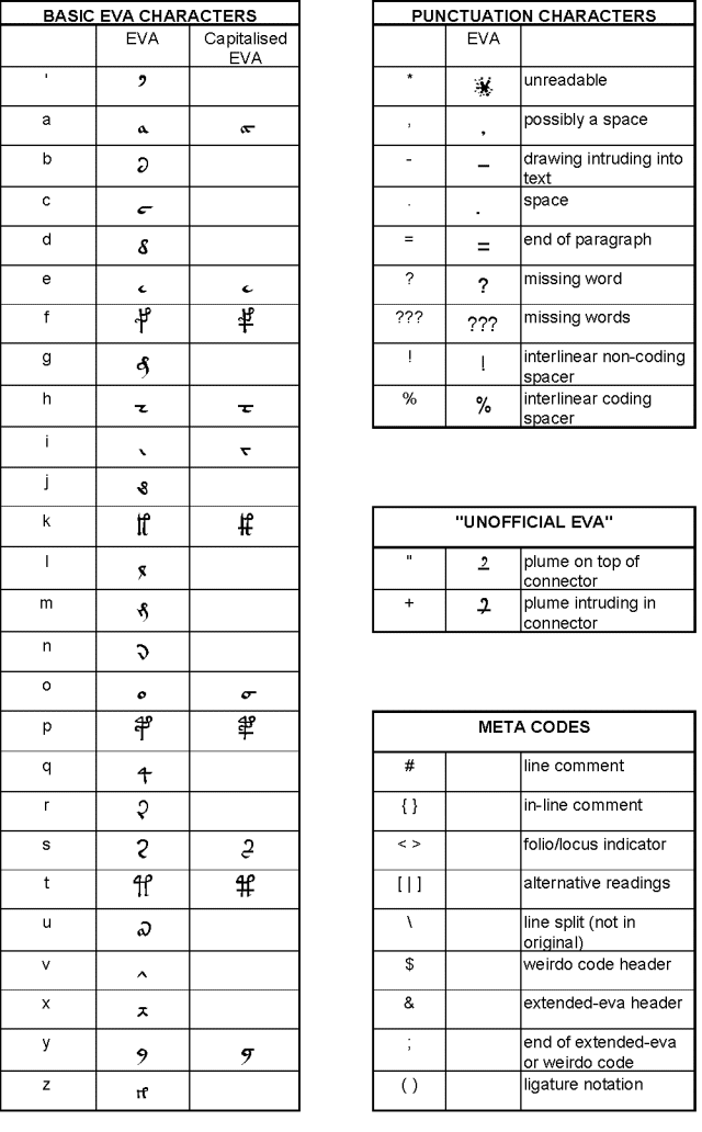 EVA originally stood for European Voynich Alphabet, but later became 'Extensible Voynich Alphabet'. It was designed to be similar to Frogguy, yet use only alphabetical characters. It was designed by Gabriel Landini and myself with important contributions and suggestions from Jacques Guy. Its design was part of a larger scheme which included: