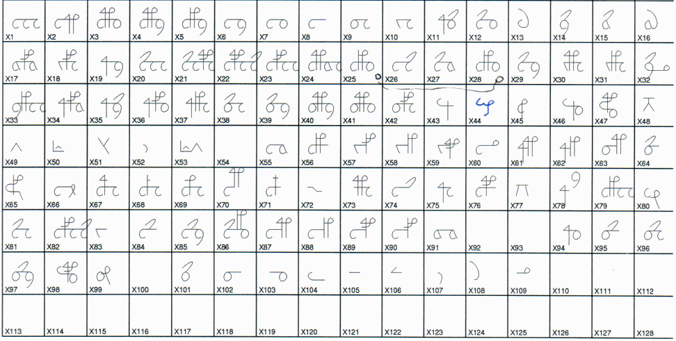 One thing that immediately appears from this table is that the various transcribers did not agree on what constitutes a single character in the Voynich MS text, and this turns out to be one of the most difficult points for transcription. Later, Jim Reeds showed that many characters in the Voynich MS cannot be represented exactly by any of the existing alphabets. There are some 'rare' characters, and in addition there are what appear to be ligatures of several characters. These characters have come to be called 'weirdoes', though here I will use the term 'rare characters'. Jim Reeds produced a document with an overview of these rare characters, calling them 'X1' to 'X128'. An excerpt of this barely known document is shown below.